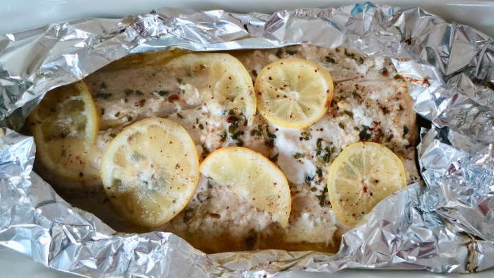 Make sure you don’t have any fish bones in your fish. Place the whole half part of the fish on tinfoil (if you use a grill) or an ovenproof ovenware if prepared in oven. Use a bowl to mix the marinade together. Add pressed garlic, olive oil, lemon juice, dried parsley and salt and pepper into the bowl and stir. Pour it over the whole fish. Add pieces of the butter on the fish. Finish with adding slices of lemon. Make the tinfoil together before placing on the grill (or oven). Let the fish bake for 25 minutes or until the thickest part has a temperature of 137ºF.