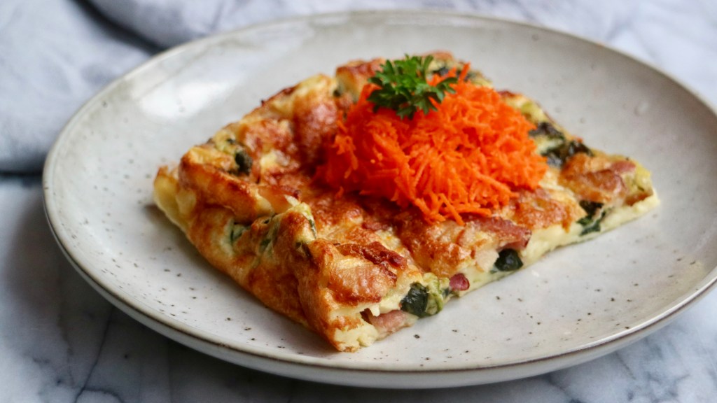 Add egg, milk, salt and flour into a bowl. Whisk it all together to a smooth batter. Use an oven tray, approximately 21 in × 15 in. Add the fried bacon and spinach. Slice the scallions really thin and add on the same oven tray. Pour the batter over bacon, spinach and scallions.