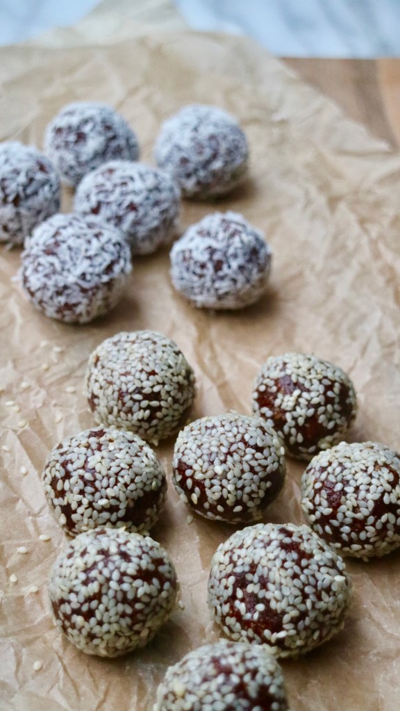Add the dough onto a baking board. Divide the dough into approximately 15 pieces and roll into balls with wet hands. Roll each ball in coconut flakes and/or sesame seeds.